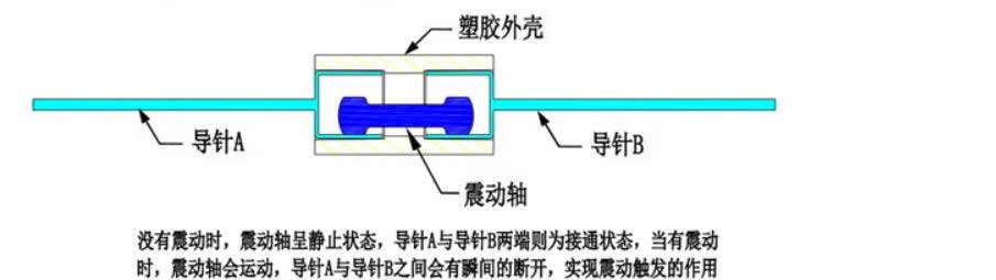 2、产品震动时,震动开关瞬间断开,输出端输出高电平,绿色指示灯不亮;