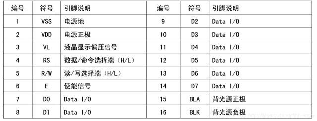 | 1 | VSS | 电源地 | 9 | D2 | 数据 |