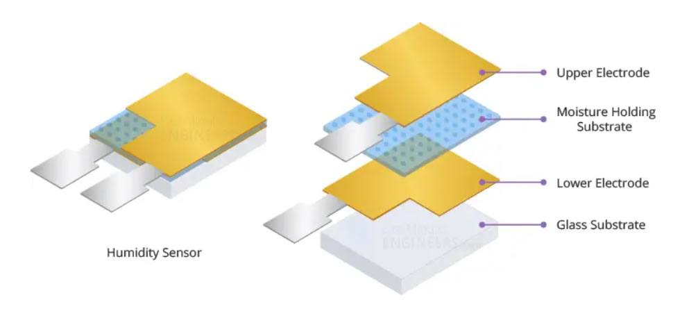 湿度传感部件有两个电极,中间有一个保湿基底(通常是盐或导电塑料聚合物)。随着湿度的升高,基板吸收水蒸气,导致离子的释放和两个电极之间电阻的降低。电阻的变化与湿度成正比,可以测量湿度来估计相对湿度。