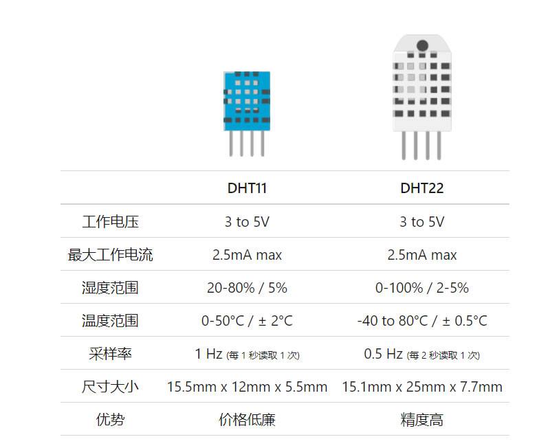 无论是工业领域还是我们的日常生活,温度和湿度一直都是两个比较重要的指标,DHT11 和 DHT22 是 DHT 系列中使用最广泛的两种传感器。它们有着相同的引脚,用法一致,下图是两者的规格对比: