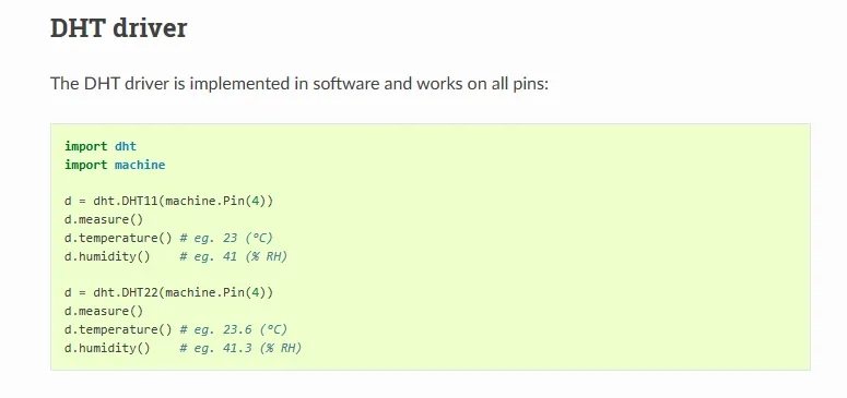 MicroPython 的标准库中含有 DHT 库,可以导入模块即可直接使用,具体使用方法可以查看官方手册open in new window实际上只有一个使用案例,这里我们可以看到 DHT11 和 DHT22 传感器是如何使用的。