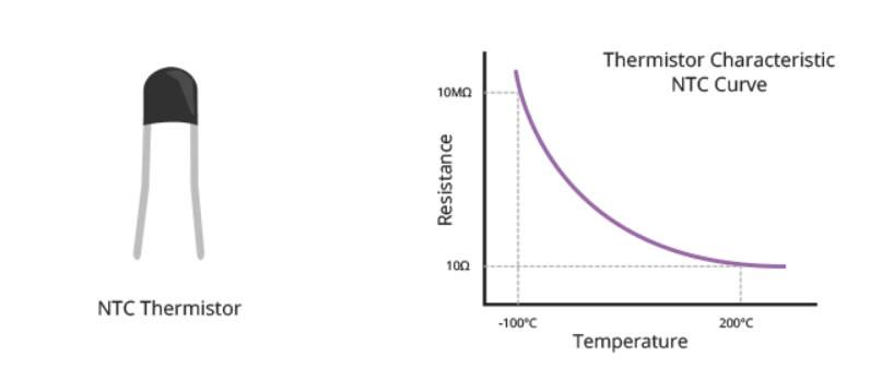 DHT11 与 DHT22 还包括用于测量温度的 NTC(热敏电阻)。热敏电阻是一种电阻随温度变化的电阻器。从技术上讲,所有电阻器都是热敏电阻,因为它们的电阻随温度略有变化,但这种变化通常非常小,难以测量。热敏电阻的设计使其电阻随温度而急剧变化(每度 100Ω 或更大),而且电阻随着温度的升高而减小。