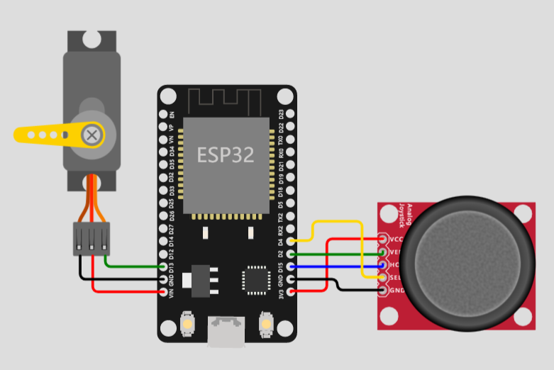 摇杆模块的 GND 接 GND;模块的 SW 接 D4,VRX 接 D15,VRY 接 D2。舵机接开发板另一侧的 5V 引脚、GND 和 D13。