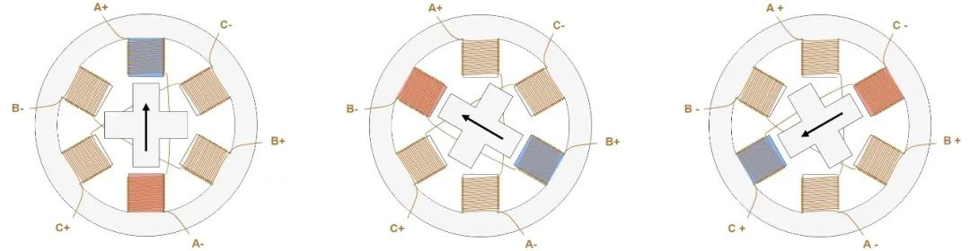 接下来B断开,C导通,1和C相之间夹角最小被吸引过去,被吸引过去之前2和D相之间夹角为1和C相之间夹角的2倍,1被吸引到C以后,2和D之间最近,此时0和A之间的夹角为2和D之间的2倍,